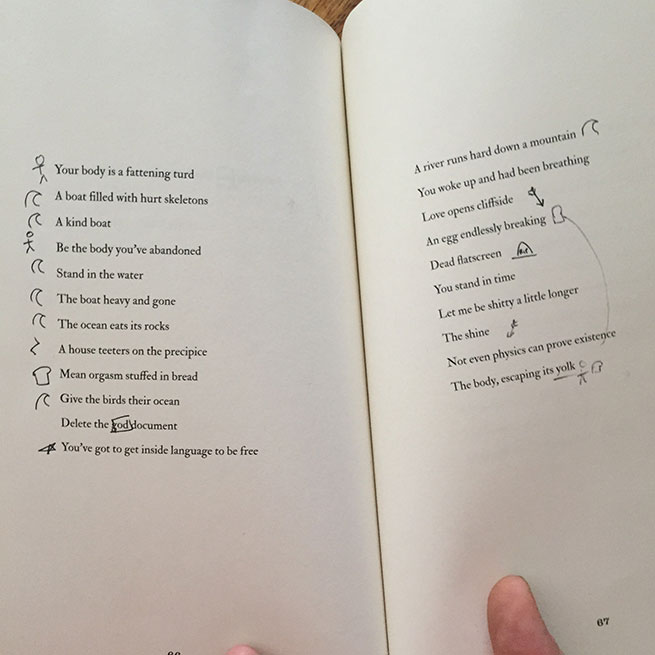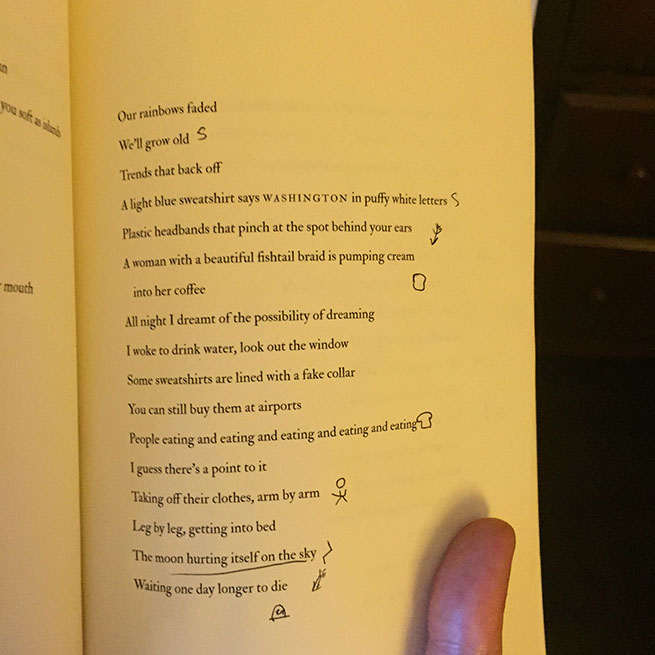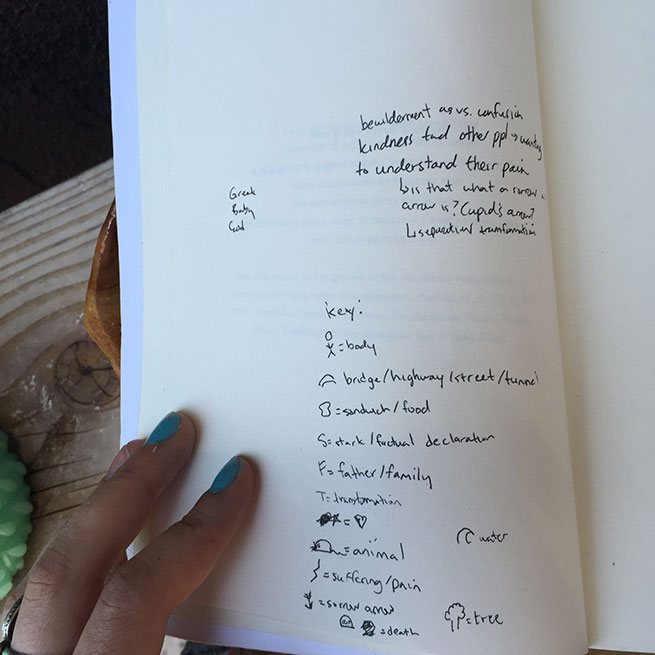 I marked made up pictograms for: body; bridge/highway/street/ tunnel; sandwich/ food; stark/ factual declaration; father/ family; transformation; <3 (lines I particularly loved) ; animal; suffering/ pain; Sorrow Arrow; death; tree; water.